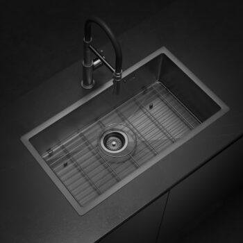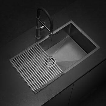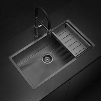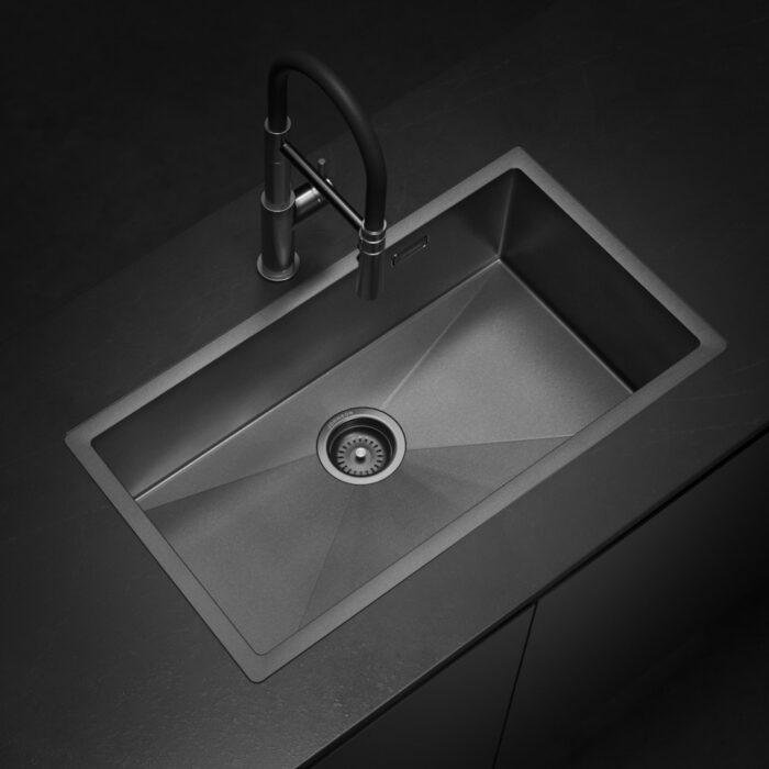 El modelo Signature Enkel 75 con acabado Gun Black Nano PVD ofrece una combinación de capacidad y sofisticación. Su avanzado recubrimiento asegura una resistencia superior a rayaduras y manchas, ideal para cocinas elegantes y funcionales.